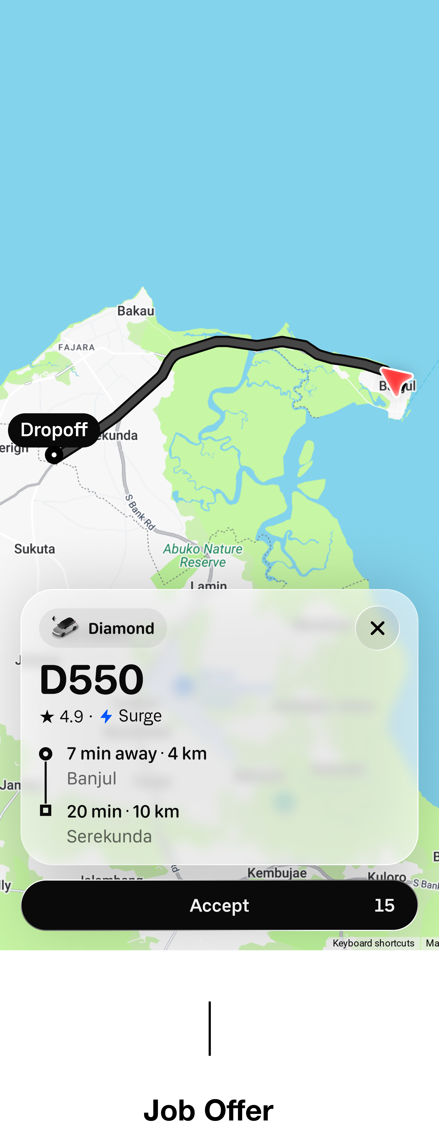The driver platform is designed to be able to see and accept requests from customers. They have the option to see the fare, distance, and vehicle type for that specific trip and they can reject or accept the trip.