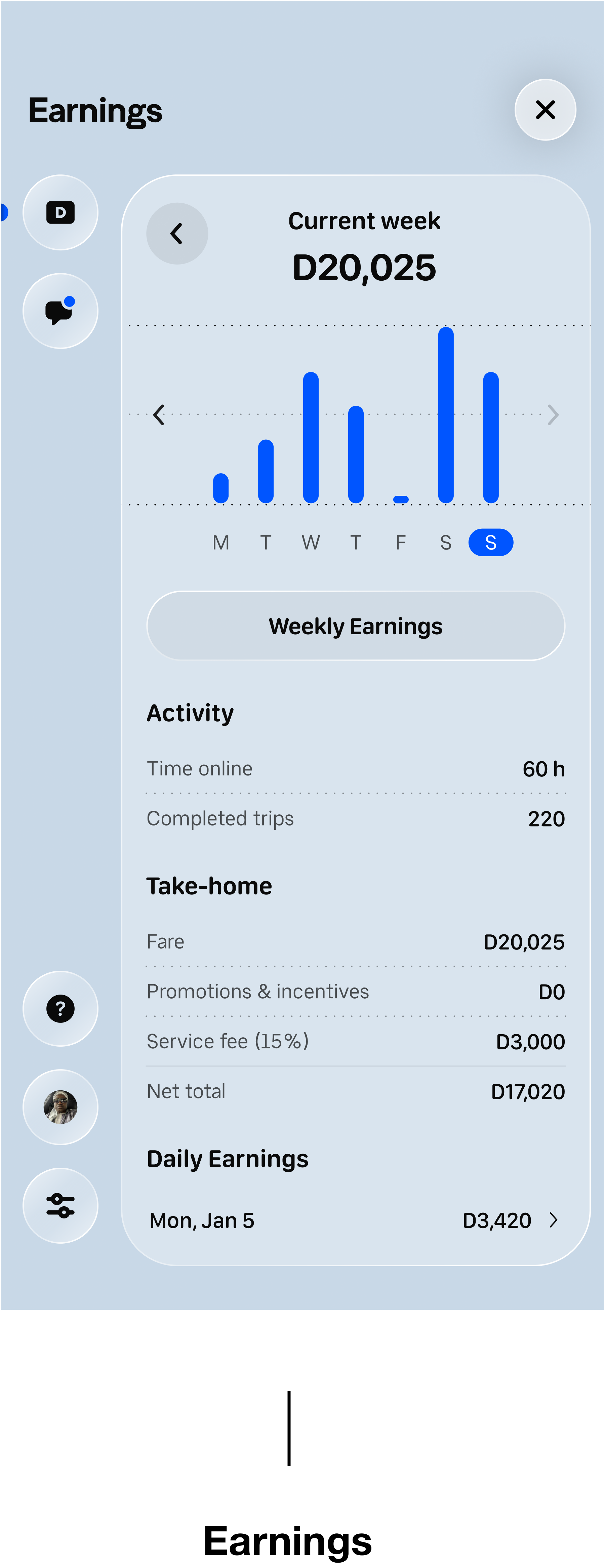 Driver Platform (Home, Menu, Activity charts, Job selection, Earnings)
